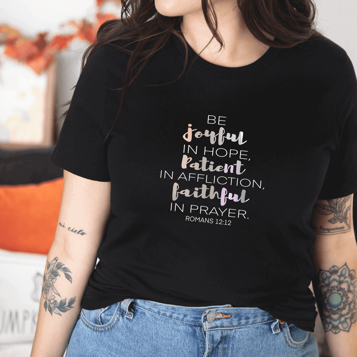 La camiseta "Sé alegre en la esperanza - Romanos 12:12" es un recordatorio diario de fe y positividad. Úselo para animar a otros o regálelo a alguien a quien le vendría bien un poco más de alegría y esperanza en su vida.